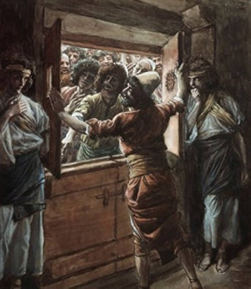 แล้วผู้ชายทั้งเมืองได้ข่าวว่ามีแขกมาเยือน พวกเขาต่างพากันมาล้อมบ้าน ขู่บังคับให้โลทส่งชายทั้งสองให้พวกเขา เพราะต้องการรุมโทรมผู้ชายด้วยกัน พวกเขาจะร่วมกันข่มขืนเหยื่อที่มาเป็นแขกของโลท
