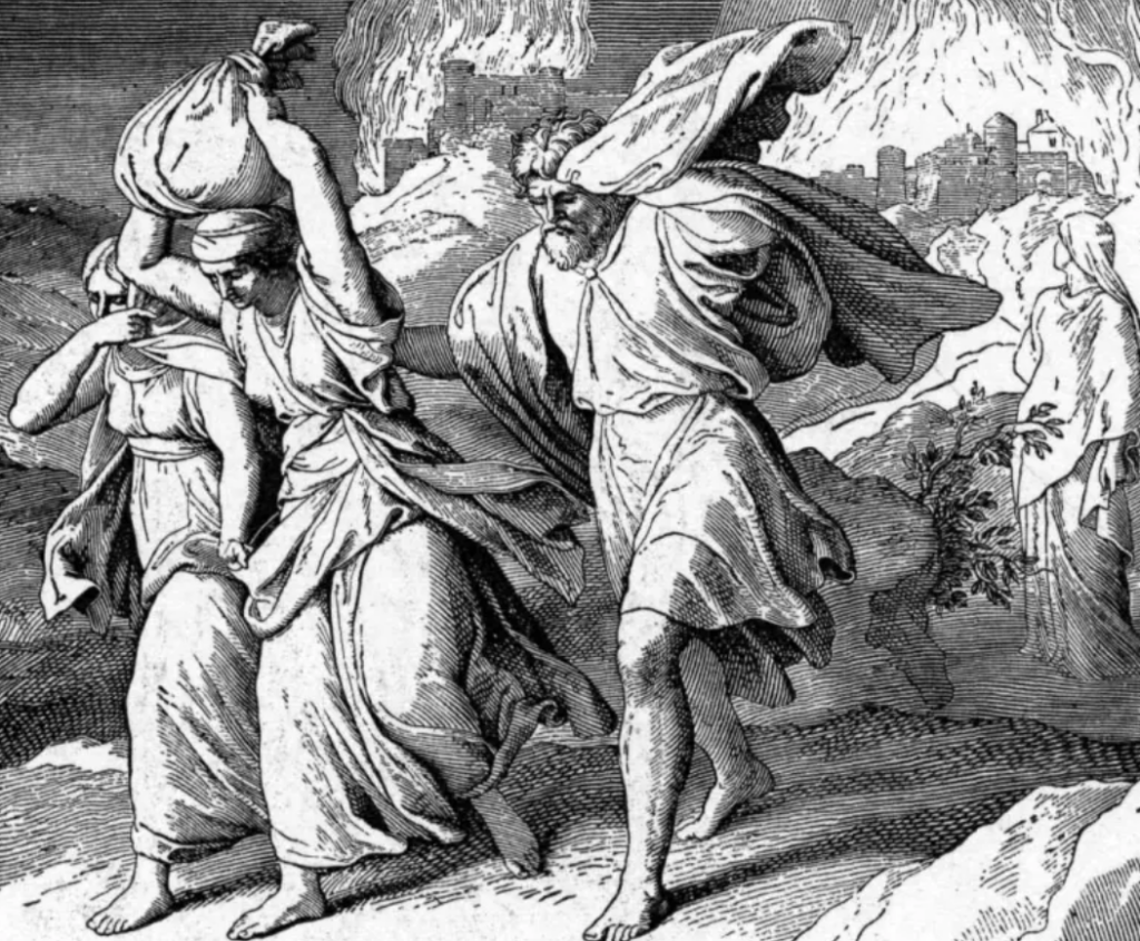 พอโลทเข้าเขตเมืองโศอาร์ ดูเหมือนยังไม่ทันเข้าตัวเมืองด้วยซ้ำ คำพิพากษาของพระเจ้าก็เกิดผลต่อเมืองโสโดม โกโมราห์ พระเจ้าทรงทำลายเมืองและผู้คนที่อยู่ในนั้นจริง ๆ แต่แล้วคนหนึ่งที่พระเจ้าทรงช่วยชีวิตไว้ หันหลังกลับไปดูทั้ง ๆ ที่ถูกห้ามแล้ว มีผู้ให้เหตุผลมากมายว่า ทำไมเธอถึงหันกลับไป ท่านผู้อ่านก็ลองคิดดูเองว่า หากเราเป็นตัวเธอ เราจะทำอย่างนั้นไหม เป็นเพราะอะไร?  เพราะความลังเล เธอยังคงโหยหาชีวิตเดิมของเธอ ทั้ง ๆ ที่ตอนนั้น ทั้งเมืองกำลังเผาไหม้ด้วยไฟที่ร้อนจัด…
